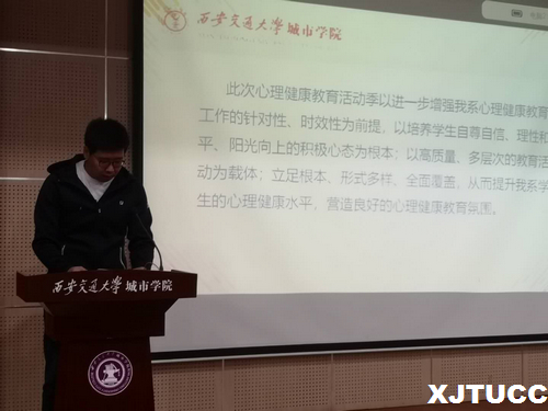 活动伊始,樊超老师向大家展示了我系往届心理健康教育活动的开展情况,并鼓励大家要积极主动学习心理健康知识,树立正确的人生观和价值观;接着,金牧羊老师将本届心理健康活动季的内容安排做一介绍,并强调大学生心理健康教育对学生健康成长起着至关重要的作用;最后,王姣老师上台致辞,她表示通过多种形式相结合的心理健康教育活动,可以帮助大学生全面提高心理健康意识,消除学生心理健康知识误区,全系师生要切实做好心理健康宣传和指导,不断促进学生心理健康教育工作的成效。