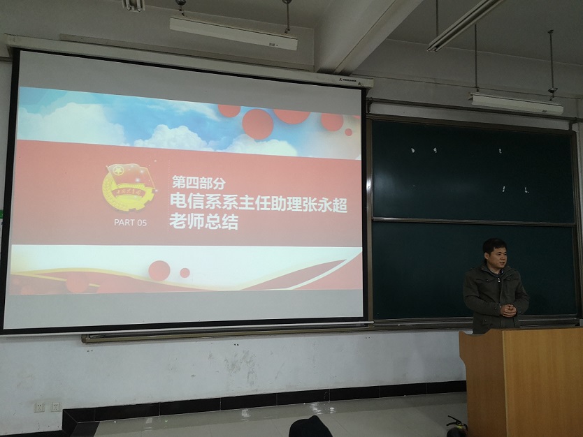 最后电信系主任助理张永超老师以传承党团全新精神,加强学风建设为主题作了总结讲话,从有效果有实施向全体同学提出要坚定信念,不忘初心,将活动形成的学习氛围继续开展下去,将各团支部建设的越来越好。