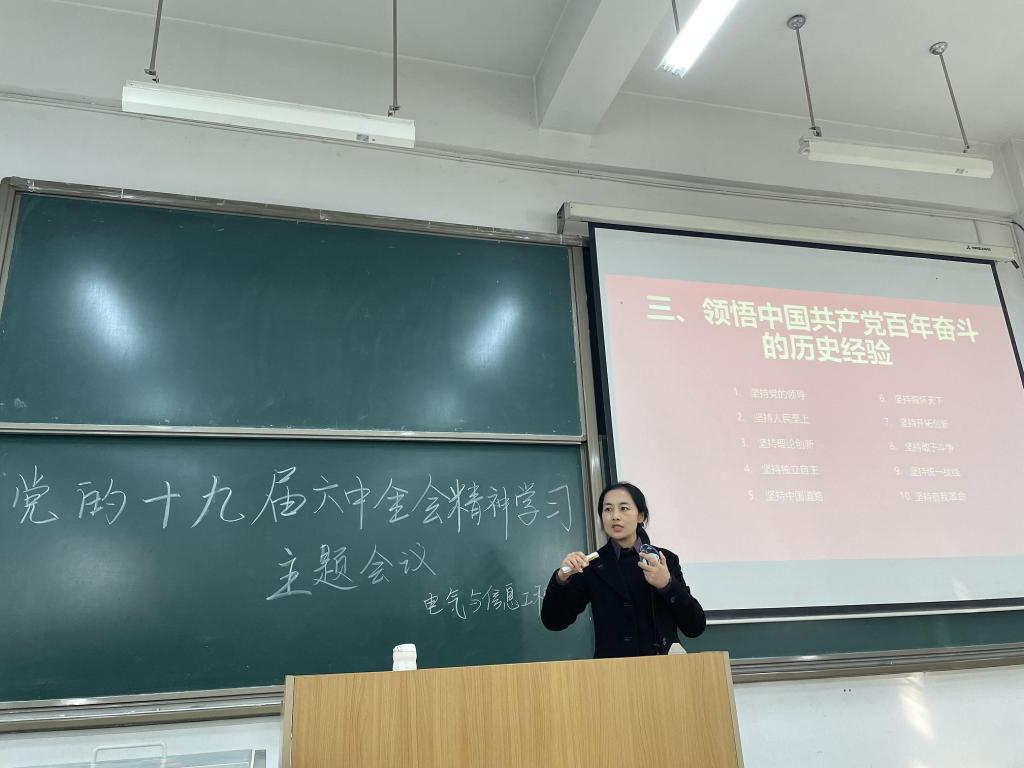 2021年12月9日,为积极响应学习党的十九届六中全会精神,明确中共中央党的百年奋斗重大成就和历史经验,提高学生党员和教师党员的个人素质,电气与信息工程系组织展开了党的十九届六中全会精神学习主题会。电气与信息工程系全体学生党员和教师党员参加了此次会议。