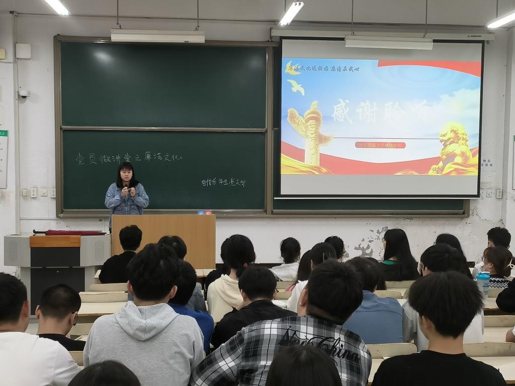 廉洁文化是中华传统文化的重要标志,也是中华优秀传统文化的重要组成部分,为传承和发扬我国传统文化,电信系学生党支部于9月21日下午6点在C100开展第二期党员微讲堂之“心至廉 路致远”。电信系全体学生党员参加,电气192曹璐同志主持了本次会议。