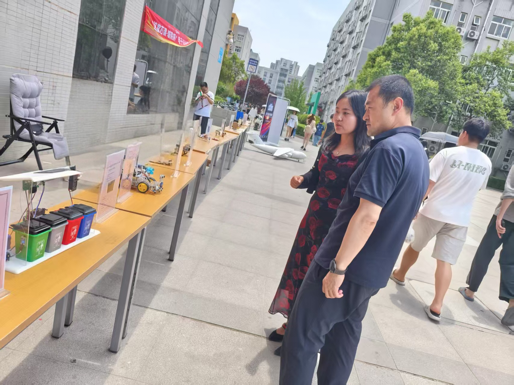 在颁奖典礼开始前,党委副书记、副校长陈书荣与学生们共同走进了大学生活动中心楼下电子设计竞赛成果展,近距离感受同学们的创新思维与实践成果。本次参赛的学生热情高涨,详细地为现场参观的师生讲解了自己作品的用途、创意、特色、使用方法等,并现场进行演示。陈老师对同学们的创新精神和实践能力予以充分肯定,并鼓励同学们要敢于突破常规思维,不断探索创新,将所学知识运用到实际中去,努力创作出更多优秀的作品。