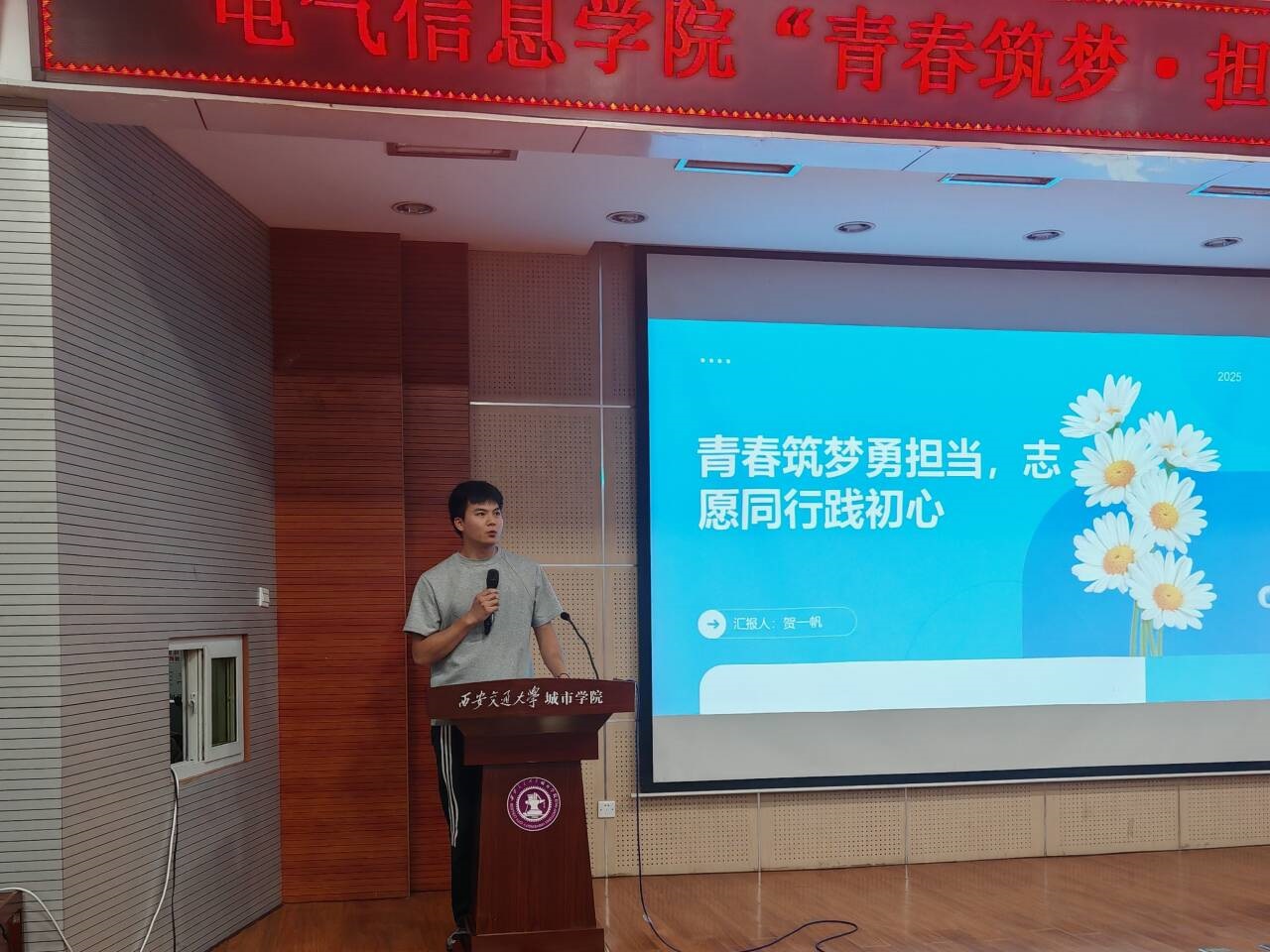 获助学金电气(专升本)2401班贺一帆同学以“从受助者到助人者,让青春在奉献中闪光”为题展开分享。他谈到,在获得助学金解决求学后顾之忧后,始终牢记“青春筑梦,担当有我”的使命。寒假期间,西安市高铁站联合“未央区益人行志愿者协会”招募大学生志愿者,他主动报名,凭借出色的组织能力担任旅客服务中心组组长,带领队员在“暖冬行动”中为旅客提供贴心服务。在马拉松赛事志愿服务中,他坚守补给分发、赛道指引岗位,用热情呐喊为选手加油助威。他表示:“每一次志愿服务都是对青春使命的践行,在奉献中我真正读懂了责任与担当。”