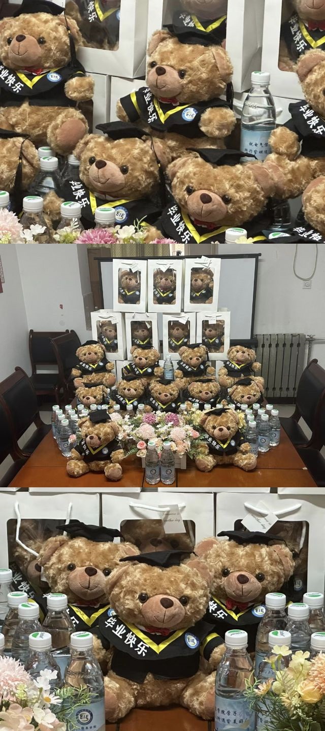 学院为毕业生准备了一份饱含深情的“毕业能量包”:一只象征勇气与守护的憨态可掬的小熊玩偶;一瓶印有精致院徽的特别版矿泉水,寓意知识活水润泽心田、母校永远是精神家园的“源头活水”;此外,更有实用且富有纪念意义的学院定制帆布袋和便携水杯以及精美文具套装。在学生一站式公寓楼下,辅导员老师们亲手将这份沉甸甸的心意送到毕业生手中,笑语盈盈间,不舍与祝福交织。“帆布袋装下的是满满的回忆,水杯提醒我们饮水思源,文具套装激励我们继续书写未来篇章。小熊像四年里并肩作战的‘战友’,刻着院徽的水更是‘Beat365唯一官方网站精神’的象征。带着它们启程,心里特别踏实温暖!”一位怀抱礼物的李同学动情地说。